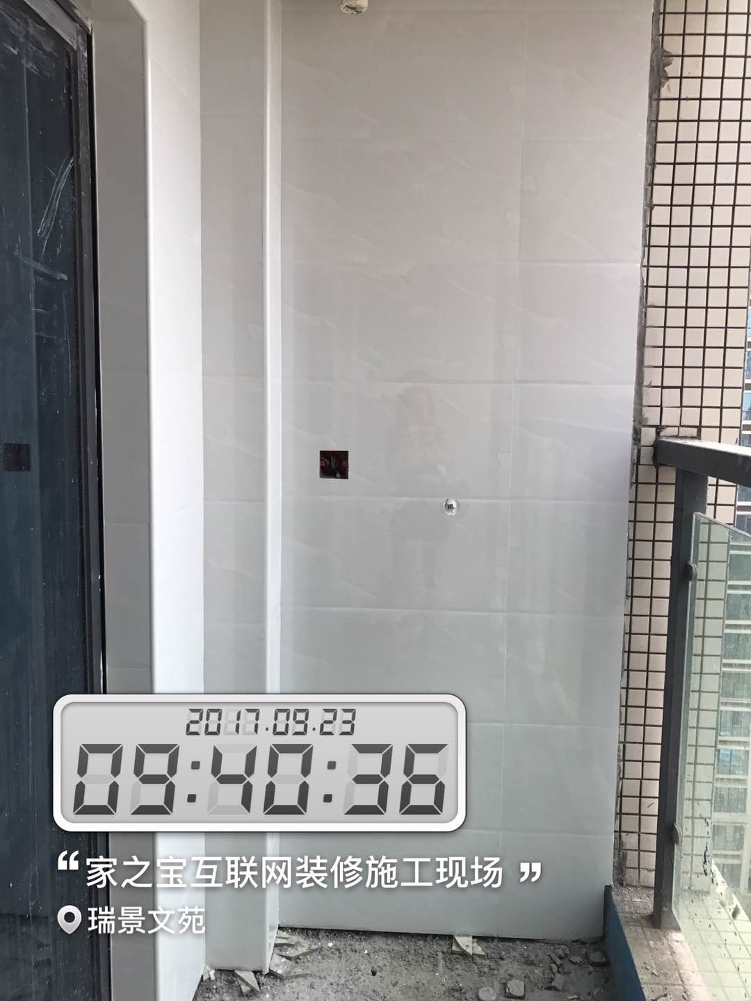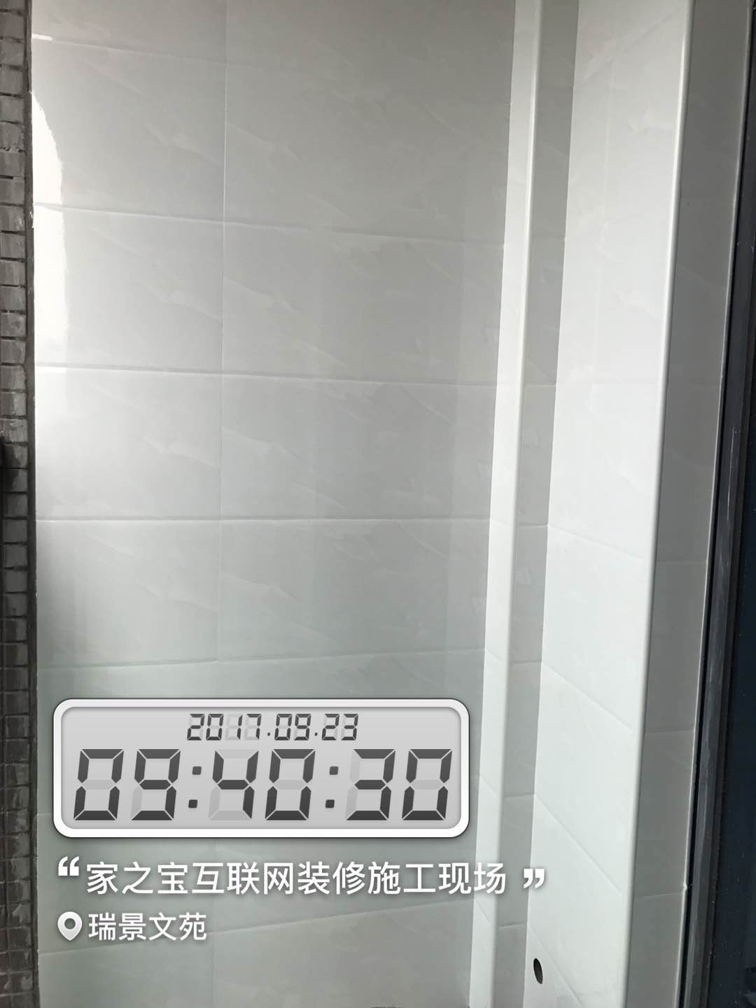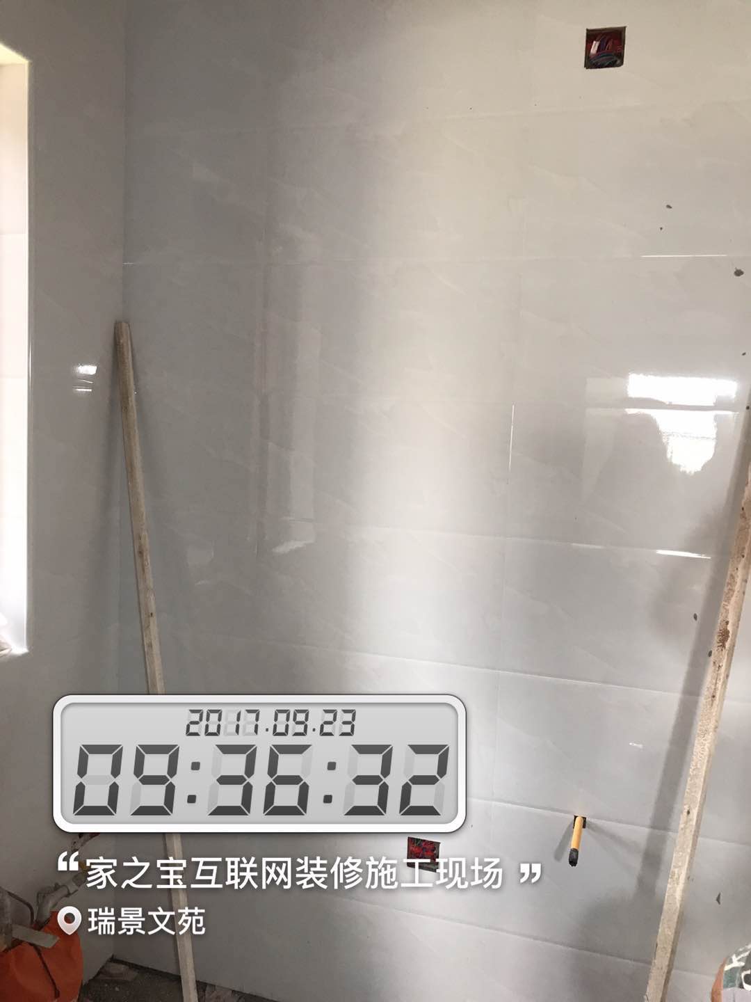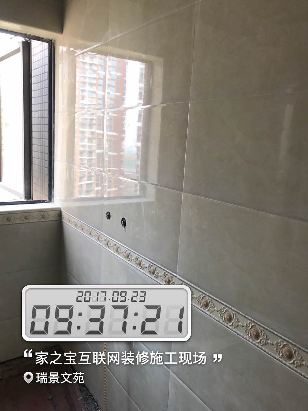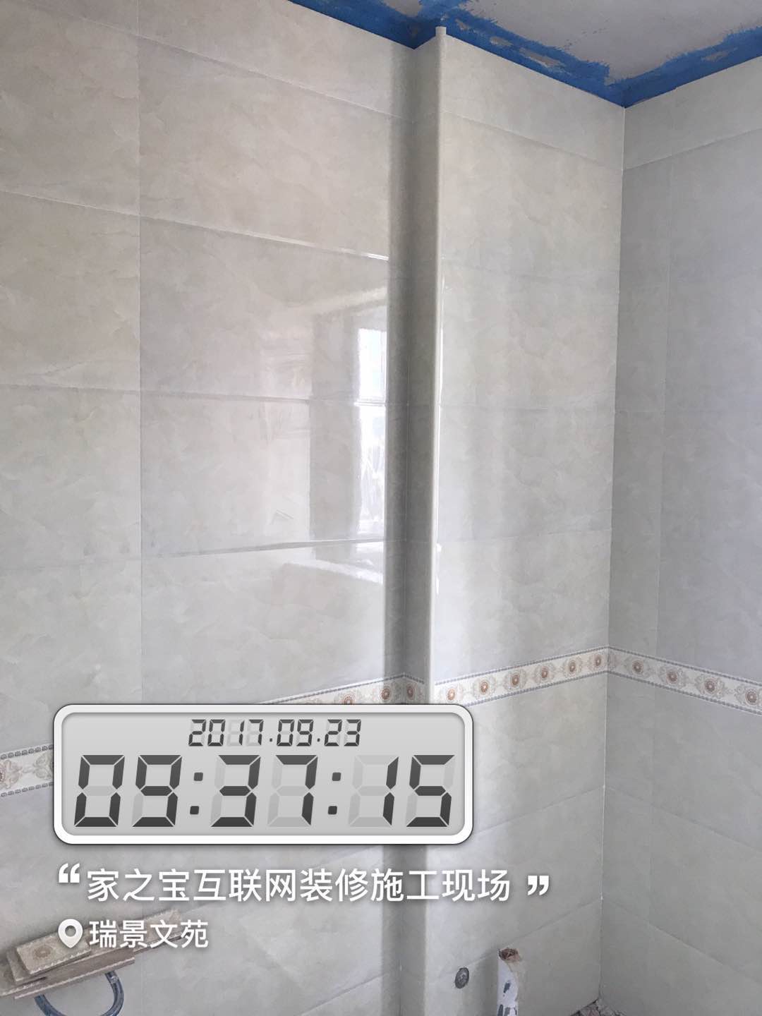 墻磚鋪貼,使用水平儀投射水平線,陽角處采用磨邊45°碰角工藝。