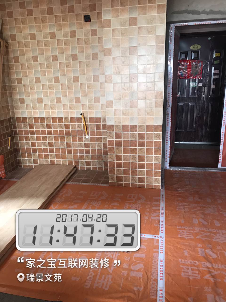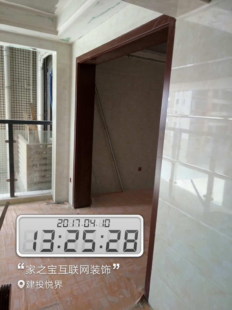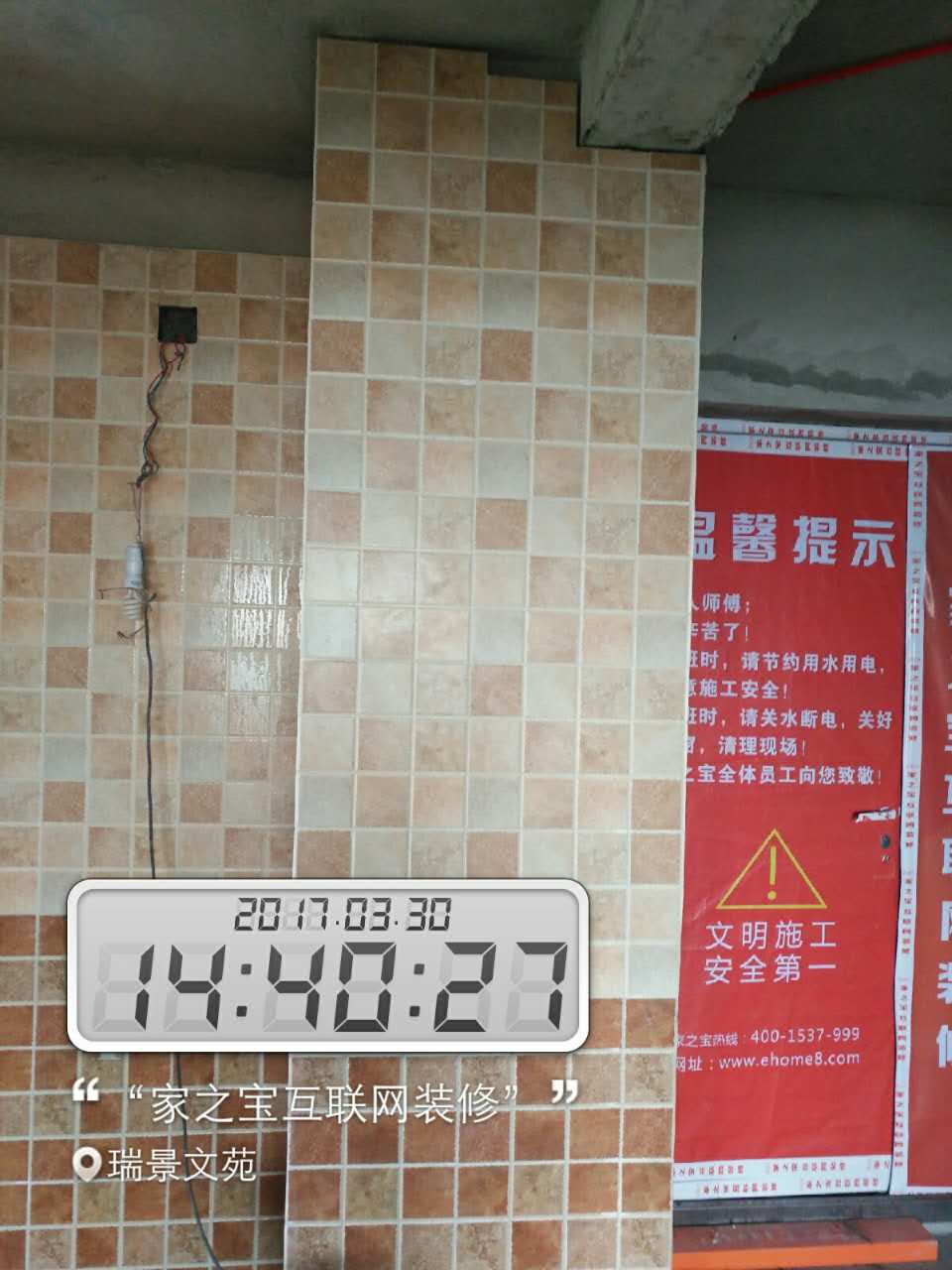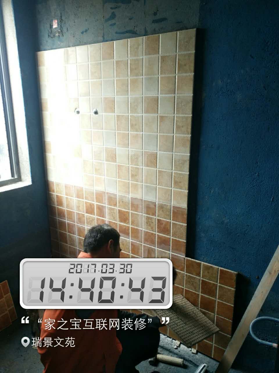 墻磚鋪貼,使用水平儀投射水平線,陽角處采用磨邊45°碰角工藝。
