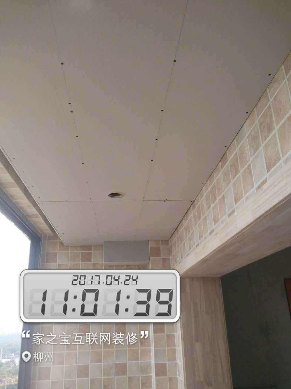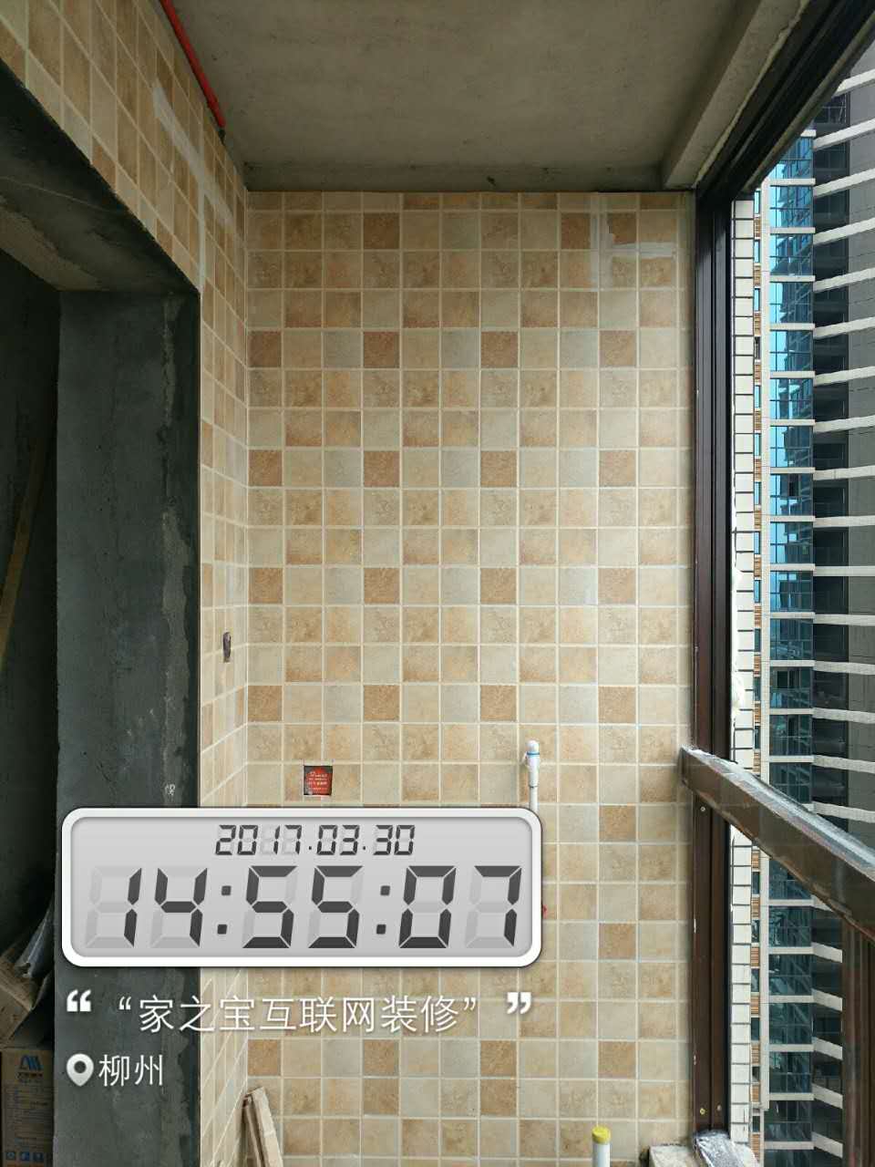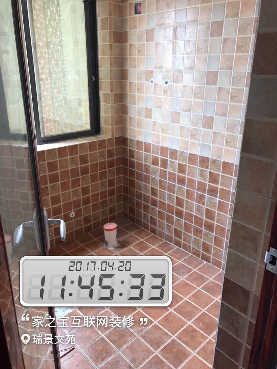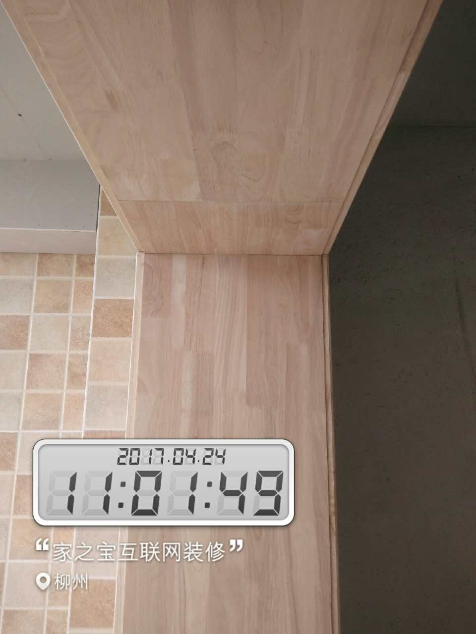 墻磚鋪貼,使用水平儀投射水平線,陽角處采用磨邊45°碰角工藝。