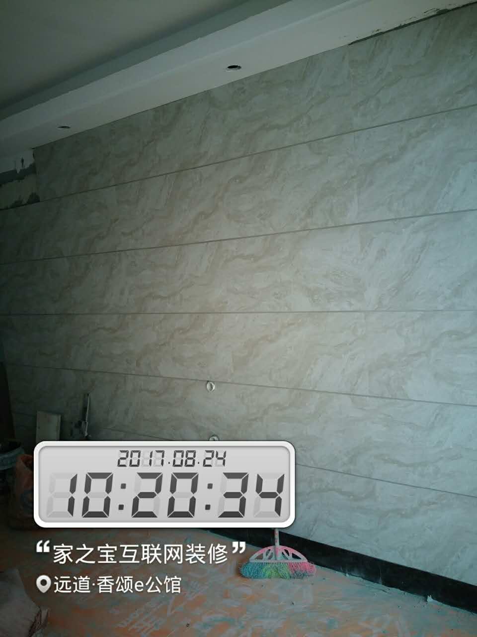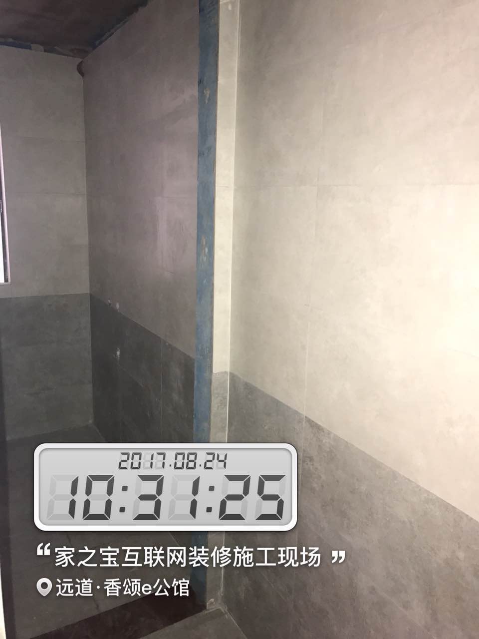 墻磚鋪貼,使用水平儀投射水平線,陽角處采用磨邊45°碰角工藝。