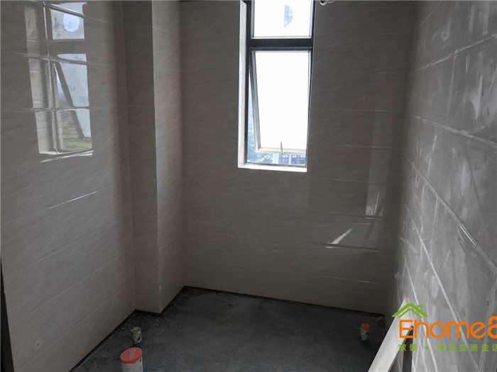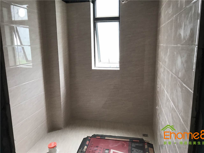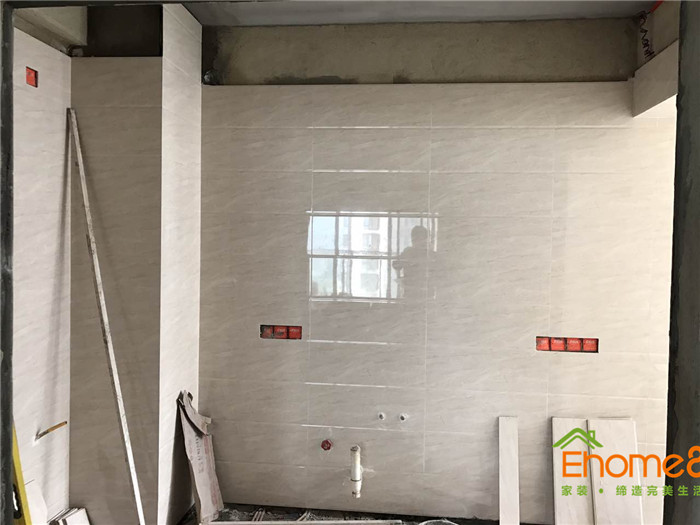 • 墻磚鋪貼,使用水平儀投射水平線,陽角處采用磨邊45°碰角工藝。