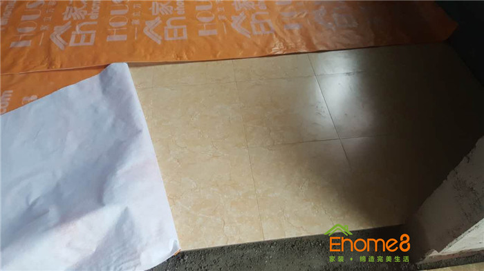 墻磚鋪貼,使用水平儀投射水平線,陽角處采用磨邊45°碰角工藝