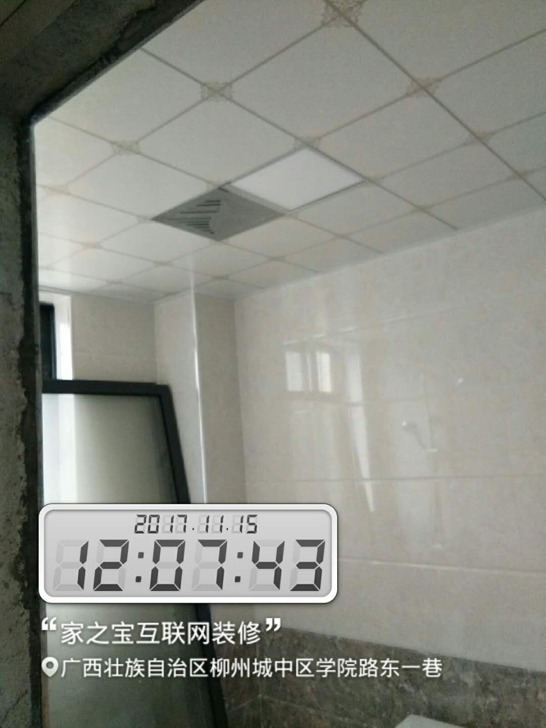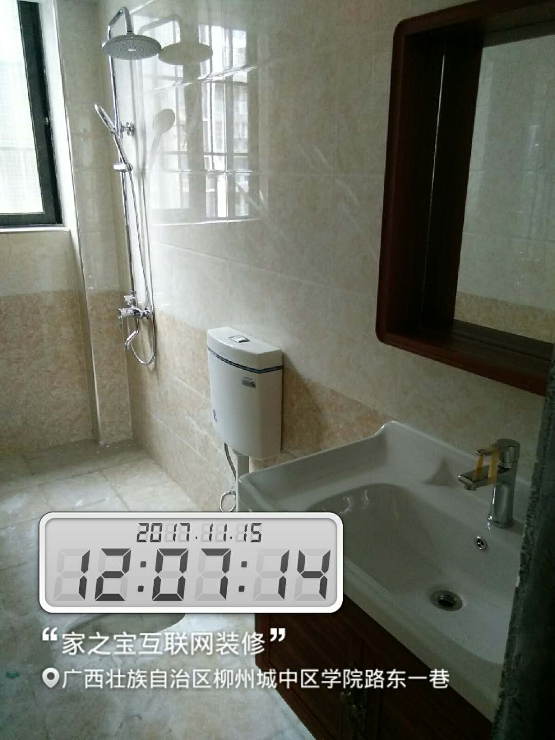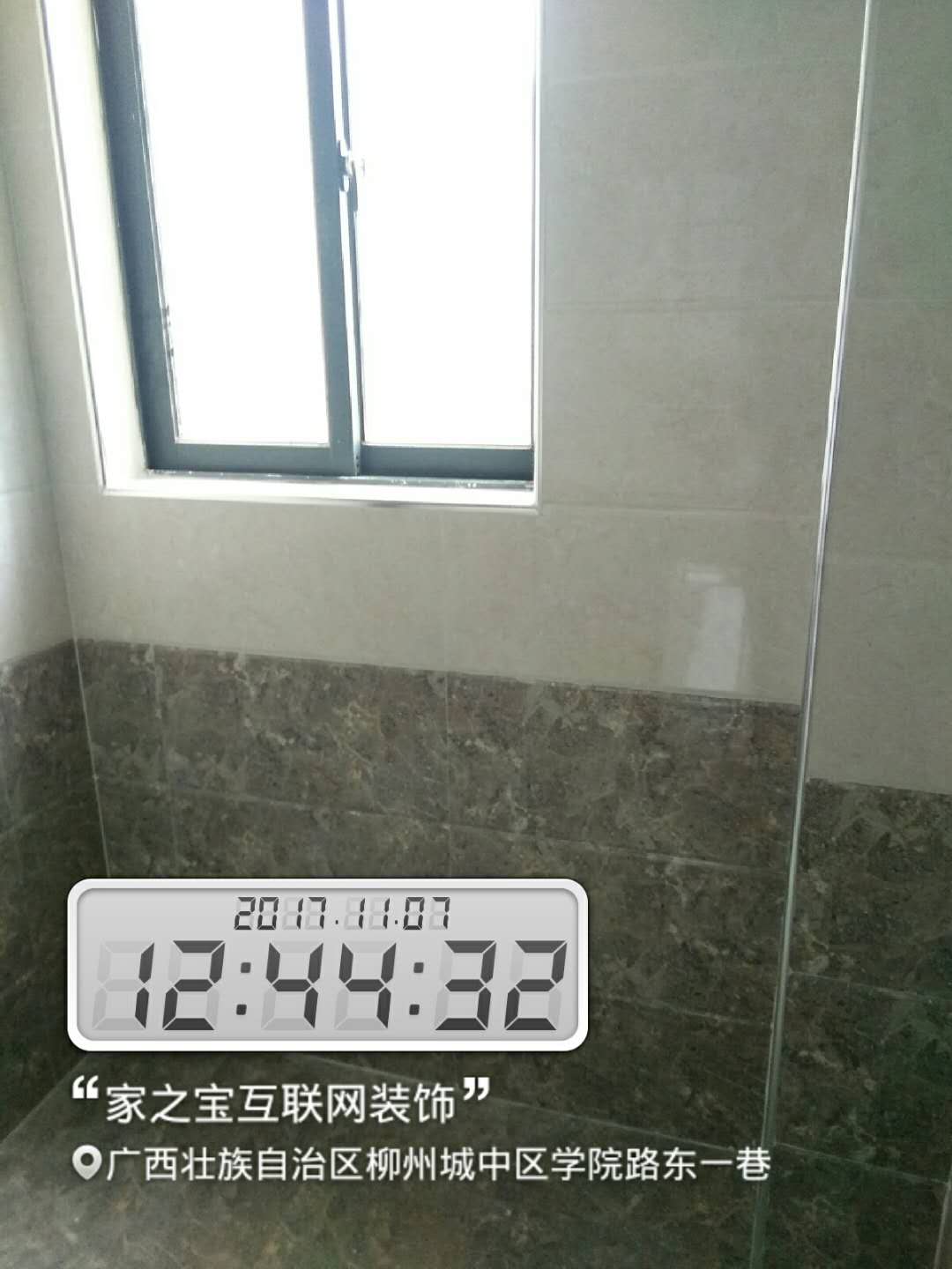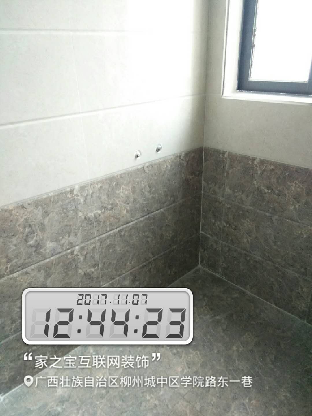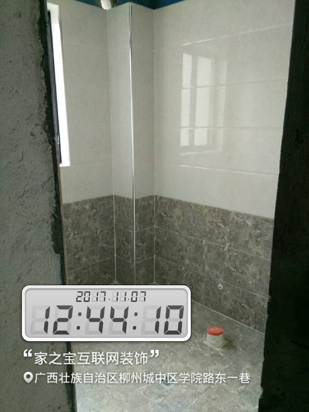 墻磚鋪貼,使用水平儀投射水平線,陽角處采用磨邊45°碰角工藝。