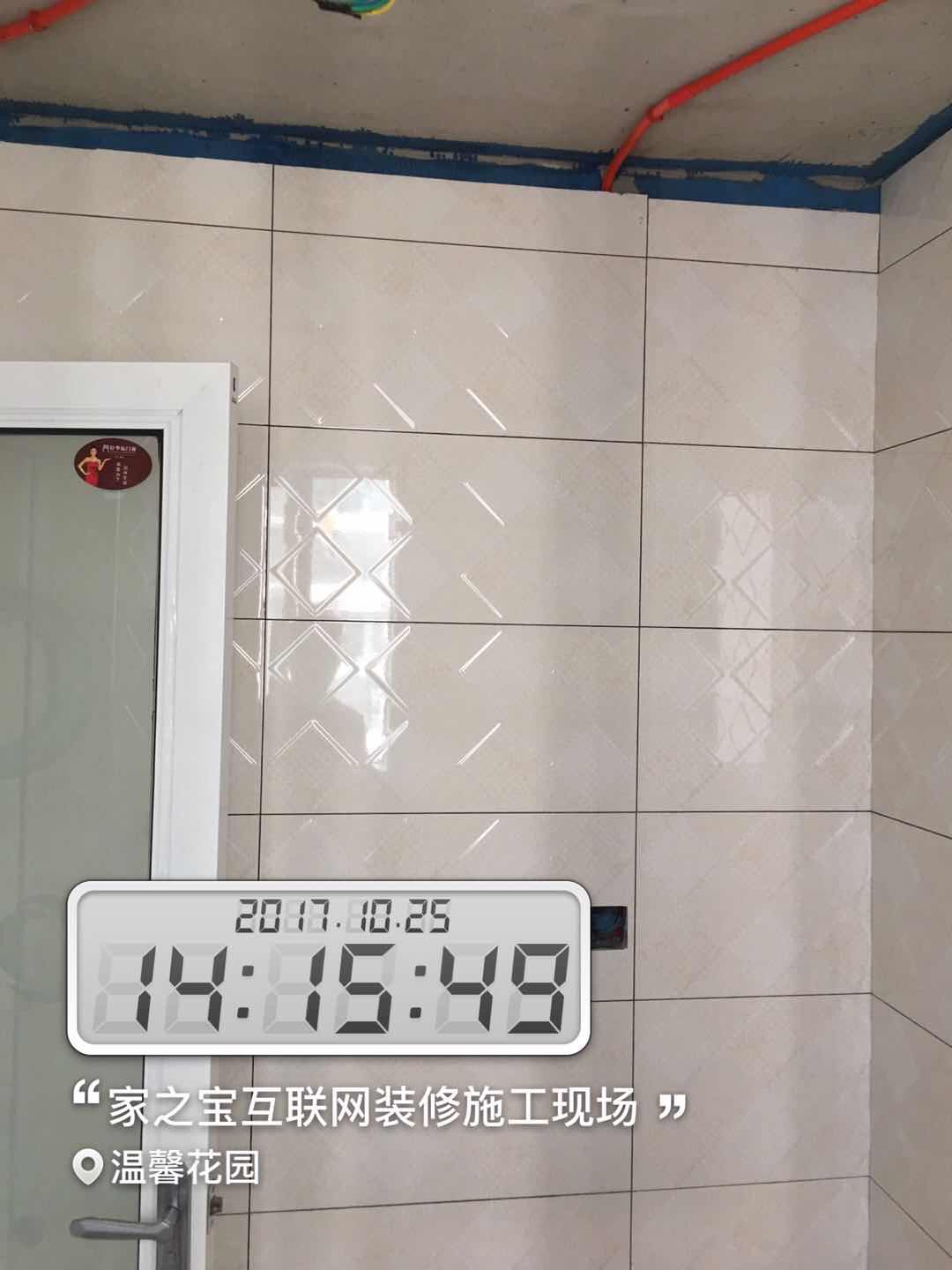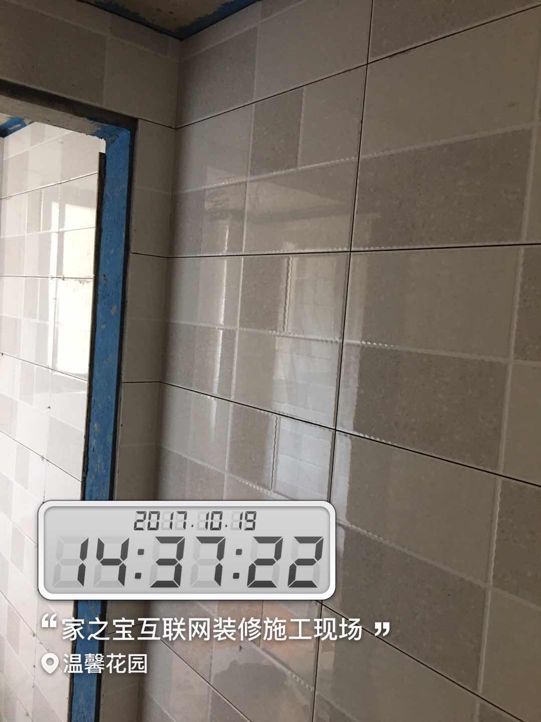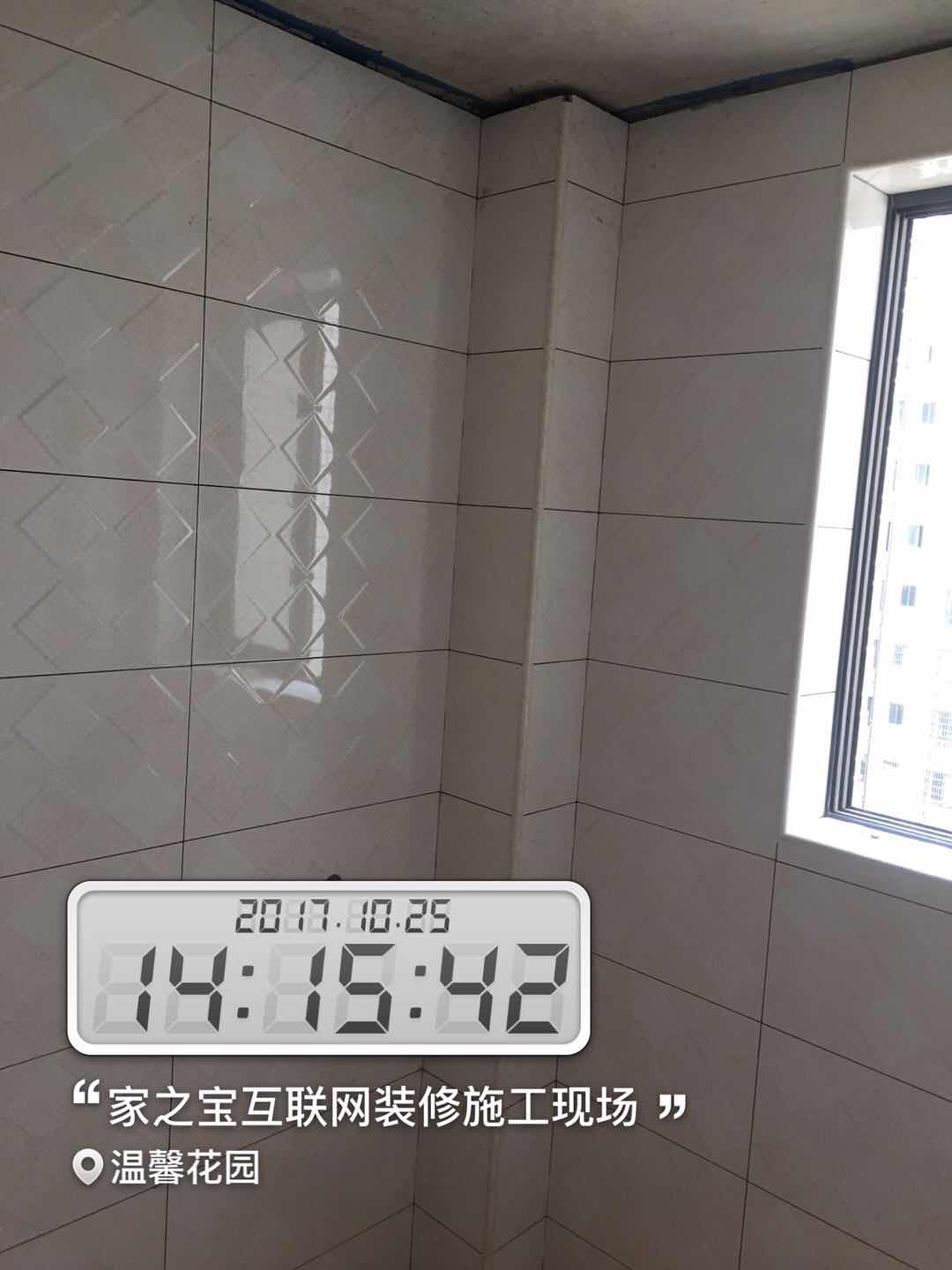 • 墻磚鋪貼,使用水平儀投射水平線,陽角處采用磨邊45°碰角工藝。