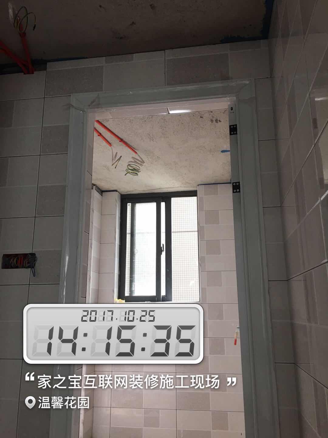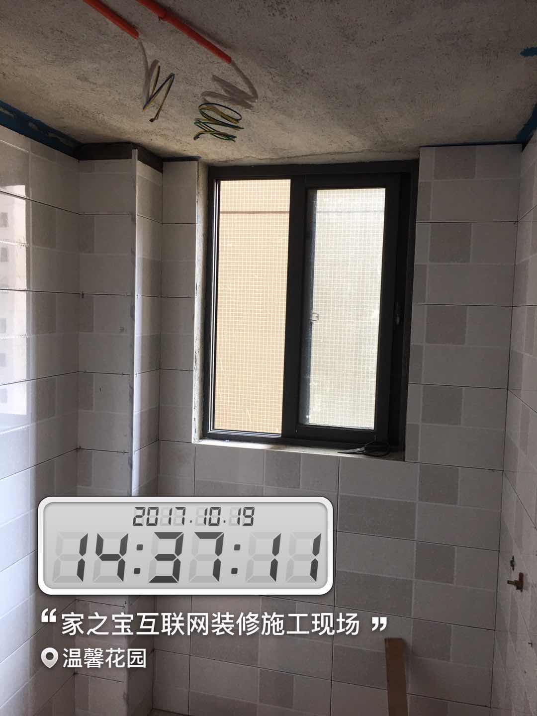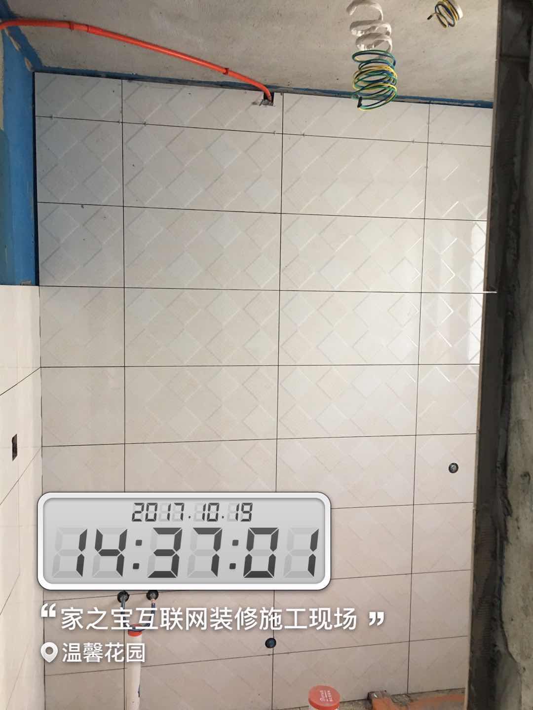 • 墻磚鋪貼,使用水平儀投射水平線,陽角處采用磨邊45°碰角工藝。