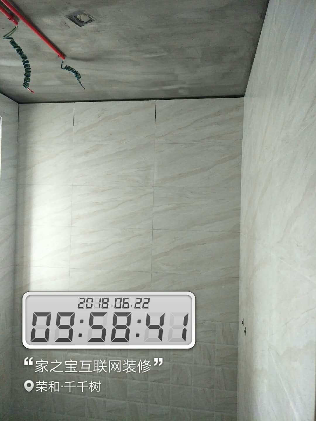 墻磚鋪貼,使用水平儀投射水平線,陽角處采用磨邊45°碰角工藝。